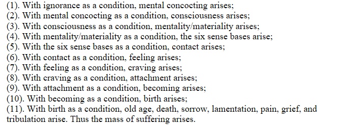 Atammayata is unconcoctability, and suffering arises (11) because in 1) concocting arises with ignorance as condition. In terms of the 3 prongs of atammayata we have conditioning arising throughout, contact arising from ayatana in steps 4 and 5, and craving arising from vedana in 6 and 7 where the vedana is feeling that arises as a reaction to +/-. The process of atammayata solitude is simply using the natural law of paticcasamuppada to end concocting, and move from separation to unity.